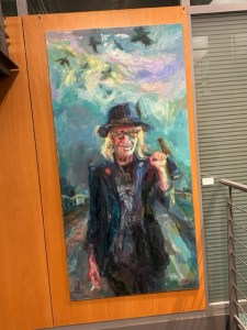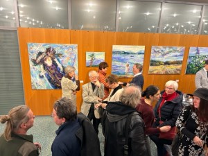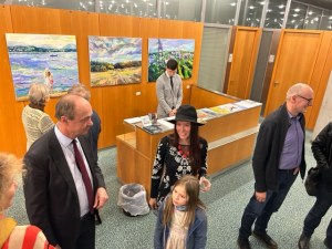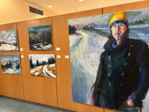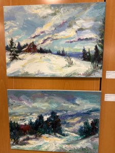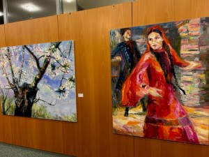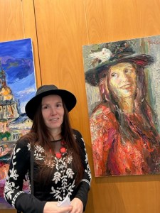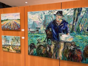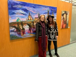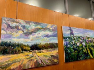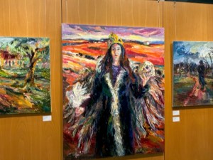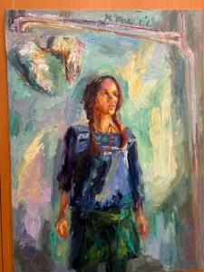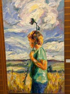 Ein Fest der Farben und der Lebensfreude in trister Jahreszeit wird den Besuchern derzeit auf drei Etagen im Bankgebäude am Albertplatz bereitet. Zu sehen sind 44 Bilder, Landschaften und Porträts, aus dem Zeitraum von 2005 bis 2023. Sie erzählen vom Unterwegssein und Ankommen, von Aufbruch, Hoffnung und Herzflug. Ein Mädchen im hellen Kleid, Hut und Umhängetasche steht nah am Wasser im Titelbild der Ausstellung. Ein Boot fährt von einer wunderschönen Landschaft zu ihr herüber ans Ufer. „Ich hörte ein Lied von Rio Reiser ,Land in Sicht` singt der Wind in mein Herz`, das mich sehr bewegt hat beim Malen“, erzählt Mandy Friedrich. Das fand sie passend als Motto für ihre Ausstellung. Malerei und Musik gehören für sie zusammen, der Rhythmus der Farben und Töne. Sie gründete eine eigene Band „Krapplack“.