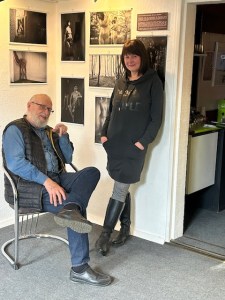 Sein Einnehmer, ebenfalls ein grinsender Tod, steht schon länger gleich hinter dem Eingang im Einnehmerhaus und nimmt die Kunstliebhaber nicht nur monetär für sich ein. Aus farbig bemaltem Holz und mit fast etwas erschrockenem Blick erinnert er an die verfließende Lebenszeit und verkörpert die ganze Tragikomik des Seins. Der Tod kann sich selbst nicht entkommen. Nun kam der Künstler Hans Scheib selbst mit seinen Arbeiten hierher. “Wir freuen uns sehr über diese tolle Ausstellung und dass ein ganz großer Künstler in unserem kleinen Einnehmerhaus zu Besuch ist“, sagte Bettina Liepe, die Vorsitzende des Kunstvereins im Einnehmerhaus zur Ausstellungseröffnung. Die Ausstellung war schon vor einem Jahr geplant, doch es hat nicht geklappt auch aus gesundheitlichen Gründen. Das Gehen fiel Hans Scheib sichtlich schwer, gestützt auf einen Rollator und sprechen konnte er nicht aufgrund seiner Erkrankung. Begleitet von seiner Frau Anna Cumin freute er sich ebenso über das große Besucherinteresse, unten ihnen viele bekannte Künstler und Gleichgesinnte im Geist wie Ralf Kerbach, Peter Graf und Eckhart Kempin.