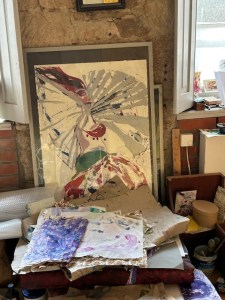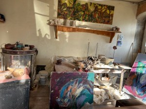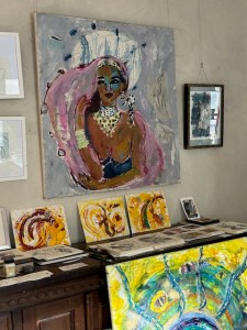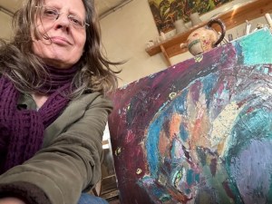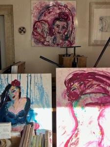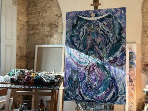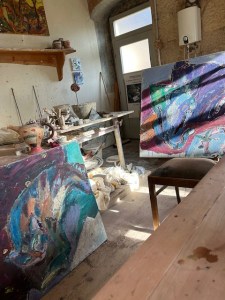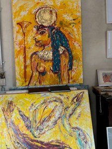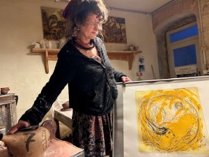 Schwungvolles Farb- und Formenspiel & weibliche Urkraft verwoben: Die Künstlerin Michele Cyranka in ihrem Schaffensreich in Tharandt.