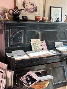 Die Augen gehen einem über und das Herz auf im Atelier von Michele Cyranka. Es ist ein eigener Kosmos, den sie hier erschaffen hat. „Mein Herz ist meine Arbeitsgrundlage“, sagt sie. Ehemals, anfangs des 20. Jahrhunderts, befand sich in dem Gebäude an der Roßmäßler Straße 46 in Tharandt eine Schreibwaren- und Papierhandlung, die zwei Schwestern, beide unverheiratet, führten. Das Haus stand 20 Jahre leer, die Fensterläden zugenagelt. Bis Michele Cyranka 2016 die drei Erdgeschossräume zufällig entdeckte auf der Suche nach etwas Neuen. „Ich hatte großes Glück, dass der Hauseigentümer das denkmalgeschützte Gebäude gerade sanierte und vieles im originalen Zustand gelassen hat wie die Holzdielen, die hellen, unverputzten Sandsteinwände, gemauerte Ziegelsimse über den Fenstern, Verzierungen und sichtbare Rohrleitungen entlang der Decke“, erzählt die Künstlerin. „Es ist für mich und ihn ein Gewinn, zu einem moderaten Preis. Es ist als hätten die Räume auf mich gewartet.“ Sie fühlt sich wohl hier. „Es hat auch wieder mit Papier zu tun.“ Die Druckerpresse im mittleren Raum ist reich bestückt mit Papieren.