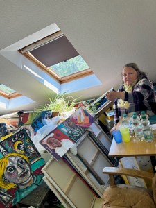 Ihr farbenfrohes Bilderreich ist riesig, der Platz leider begrenzt. Einige Werke stehen aufgereiht schon im Treppenhaus. Kleinere und große Formate, in denen Menschen, Tiere und Natur sich farb- und zeichenreich verbinden. Eine Frau mit Tauben, Nachtvögel, Stier und Schäfchen, Katzen und  ein dunkles Tier mit einer Schlange im Maul. Dazwischen Köpfe und Gesichter in urwüchsigen Landschaften, über denen rote Vögel kreisen und ein verletztes Tier zappelt in einem himmelblau erhobenen Arm. „Ganzheit gefragt“ steht als Bildtitel auf der Rückseite einer Leinwand. Die Ateliertür steht offen. Ein Raum voller Bilder empfängt die Besucher in dem Gebäude, im Hof der Autogalerie Börner auf der Kesselsdorfer Straße 6 in Freital-Wurgwitz.