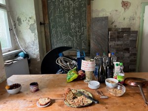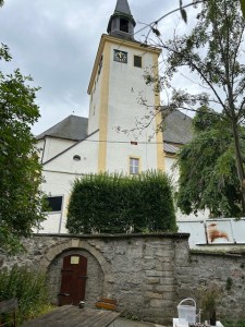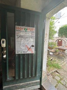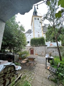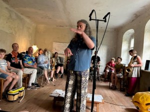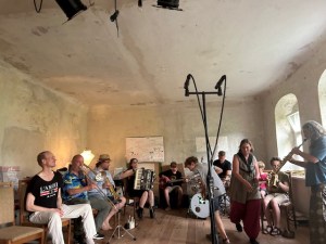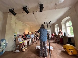 Diesmal drehte sich alles um Rhythmus in dem einwöchigen Musik-Workshop mit dem Dozenten und Schlagzeuger Matthias Macht und dem Jazzmusiker und Leiter des Musiksommer Bärenstein Hartmut Dorschner. Vor dem Mikro stehen nacheinander die Teilnehmer. Junge und etwas ältere, schon erfahrene Musiker, reihum. Sie heben bemalte und beschriftete Karten mit Symbolen und Titeln der selbst erdachten Musikstücke und Songs hoch und die anderen spielen und improvisieren diese mit viel Spaß und Einfällen zusammen im Orchester. Zehn Musikanten haben sich dazu versammelt im Veranstaltungsraum im Obergeschoß vom Kunsthaus Bärenstein, zugleich Wohn- und Schaffensort von Hartmut Dorschner. Die Töne hüpften, sprangen, schwebten umher. Mal klang es wie ein Frosch, der lustig im Teich quakte, mal nach Jazz, Swing und Reggae, mal urwüchsig erdig und geheimnisvoll mit der erzählten Mär von einem Waldweiblein aus dem Erzgebirge. Frei aus dem Bauch und fabulierfreudig tönte und erzählte der Geschichtenerzähler Michael Cech aus Dresden solo und zusammen mit dem BärensteinOrchester. Die Musiker bewegten sich auch samt Instrumenten durch den Raum, als ob sie ihre Töne wieder einfangen wollten. Schön zu erleben das Zusammenspiel und die Klangvielfalt von Trompete, Saxofon, Akkordeon, E-Piano, Schlagzeug, kleinen Trommeln bis zu E-Gitarren. Die jüngste Zuhörerin saß mit Kopfhörern auf dem Schoß von Papa und Mama abwechselnd, vergnügt lauschend und hin und wieder jauchzend einstimmend in das Konzert. Abschließend war auch ein Lied, „Skandal im Bielatal“ gegen die geplante Ansiedlung einer Lithium-Fabrik und damit einhergehender Naturzerstörung in der Umgebung von Bärenstein zu hören. Viel Beifall gab es von den begeisterten Zuhörern nach einer Stunde für dieses bunt gefächerte, klangfreudige Konzert mit dem BärensteinOrchester, dem man weiteren Zulauf und Auftrittsorte wünscht.