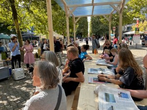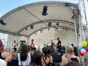 Mit Gefühl & Power mit bekannten Songs von Rio Reiser u.a. sorgten Schauspieler und Sänger Jannik Hinsch und seine Band für Schwung auf der Bühne vor dem Schauspielhaus.