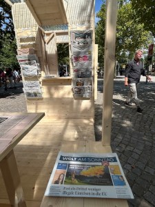 Naheging außerdem ein Ausschnitt aus „Der Komet“ nach dem Buch von Büchner-Preisträger Durs Grünbein, bei dem ein Mann in Ritterrüstung neben einer jungen Frau im Kleid steht und ein Kosmonaut vom Bühnenhimmel herabschwebt. Der Ritter liest der Zuhörerrunde aus einem Buch über Dresden vor, die Bombardierung, Schrecken und Folgen. Es geht um die Wunden der Zerstörung in der Stadt und ihren Bewohnern und den Umgang mit Geschichte in der Gegenwart. Die Uraufführung ist am 24.1.2025 unter Regie von Tilmann Köhler.