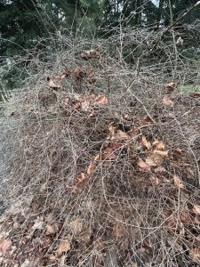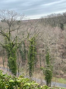 efeuumwucherte Bäume recken ihre dunklen Zweige