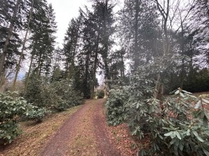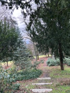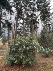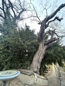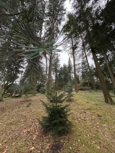 ein Tannenbaum steht Spalier und ein paar schwarze