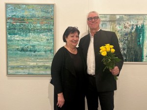 Wunderbare Farblandschaften, die an ferne Sehnsuchtsorte entführen: Galeristin Karin Weber und der Künstler Wieland Richter zur Ausstellungseröffnung in der Galerie Mitte in Dresden.
