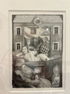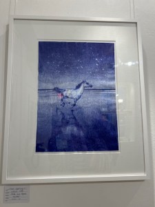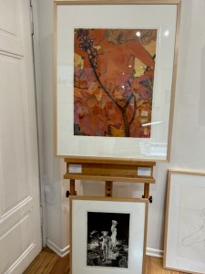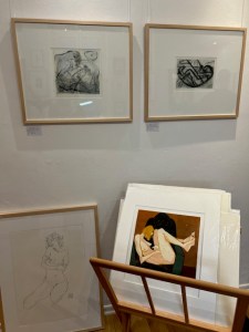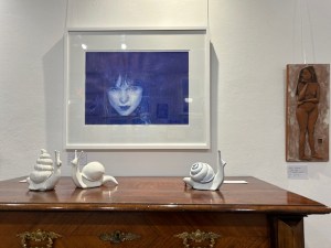 Darunter zarte, traumversunkene Gesichter, ein Rückenakt und ein „Paar mit gelber Schlange“ in Mischtechniken von Gudrun Trendafilov. Fantasievoll farbenfrohe Zeichnungen auf Seidenpapier mit Mensch-Tier-Wesen zeigt Leonore Adler, fragile und schwungvolle Körperbilder in Kaltnadelradierungen Mechthild Mansel. Wundersam-versponnene, akribische Zeichnungen mit Titeln wie „Pura Vida“, das pure Leben sind neben „Sportputten“ und einem „Sexy Boy“ als keramische Räucherfiguren in markanten blau-weiß-Farbtönen Sportputten von Nadine Wölk zu sehen. Weitere sinnlich plastische weibliche Aktzeichnungen mit Buntstift und Ölpastelle mit Blattgold veredelt zeigt im Spiel mit Stoff und Körperformen in einer neuen Bilderserie Maximilian Hagstotz, der als Porzellangestalter in der Meißner Manufaktur tätig ist. Originelle Bilder mit Nadel und Faden mit weiblichen Blütenformen stammen von „Fides Linien“ und ein zauberhaftes Porzellan-Objekt mit Rapunzelhaar von Else Gold.
