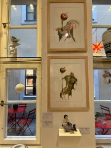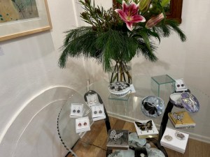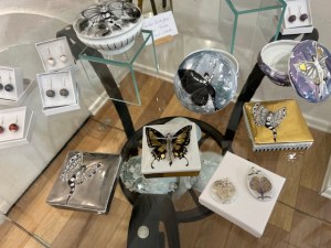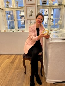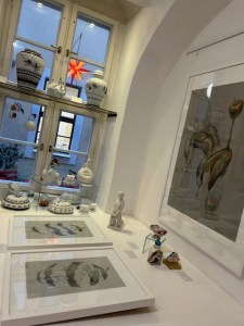 Es gibt auch eine neue Porzellanserie von Janett Noack mit dem Titel „Lovelies Butterflies“ (Liebelei der Schmetterlinge). Die schwirren in Gestalt reizvoll beflügelter Damen auf den Schmuckdosen, schwarz, golden und lüsterfarben schimmernd und funkelnd auf dem edlen Material. „Das ist alles Lupenarbeit, da viel en minature gearbeitet wird bei den Zeichnungen. Mit den verschiedenen Dekoren will ich auch die Handwerkskunst zeigen“, sagt die Porzellankünstlerin. “Wenn man künstlerisch arbeitet, braucht es Muße, Ideen und Lust, die sind jetzt da und es wird noch einiges Spannende kommen und weiter entwickelt im neuen Jahr.“ So werden bald Schmuck und große Vasen kunstvoll verziert dazukommen. Deshalb dauert diese Ausstellung auch bis zum 25. April. Damit die Galeristin Zeit hat für neue, eigene, lust- und liebevoll gestaltete Kreationen.