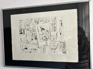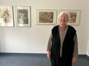 Christine Wahl ist bereits 90 Jahre alt und damit die älteste lebende Künstlerin in Dresden. Die Ausstellung versammelt Arbeiten aus ihrem reichhaltigen Schaffen aus dem Zeitraum von 1995 bis 2024. Darunter figürliche Szenen, Stillleben und Reiseimpressionen, farbenfrohe Aquarell- und Federzeichnungen mit Landschaften auf Kreta, Menschen auf dem Markt, ein Palmenhain auf Sizilien, Pinien in Kroatien und eine Ansicht vom „Großen Garten“ in Dresden. Sie macht nicht viele Worte um ihre Bilder. Es sei doch alles zu sehen, meint Christine Wahl und lächelt. Klein und zierlich, weißer Haarknoten und aufmerksame Augen, sitzt sie auf dem Sofa in der Ausstellung. Sie trägt einen hellen Pullover, darüber eine schwarze Weste und eine korallenrote Kette. Ruhe und Klarheit strahlt sie aus, wie ihre Arbeiten. Die Liebe zur Kunst und zum Leben spricht aus jedem Bild. Sonnengelbe Quitten auf einer blauen Schale. Feigen und Trauben. Prächtige Blumensträuße in der Vase. Weibliche Akte in zarten und kraftvoll, schwungvollen Körperlinien im Atelier und in häuslicher Umgebung. Ein „Atelierstillleben“ in einer schwarz-weißen Kaltnadelradierung mit Blick durch den Bilderrahmen in den Raum zwischen Kunst und Alltagsdingen.