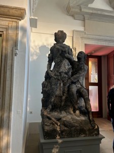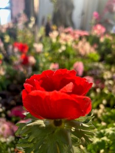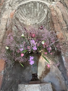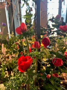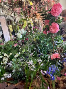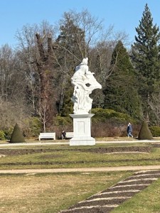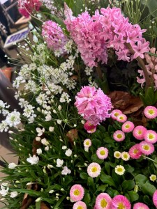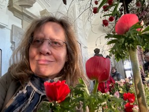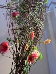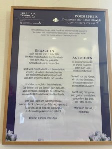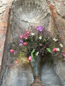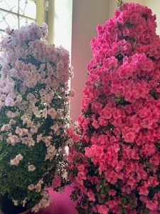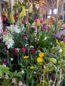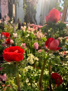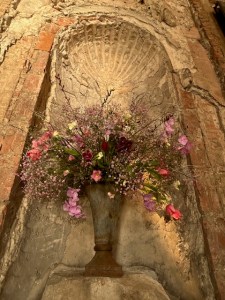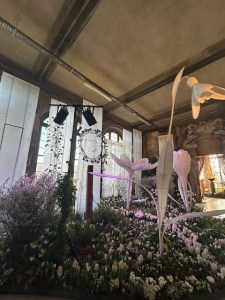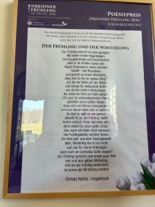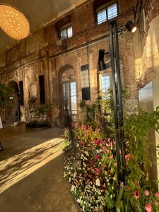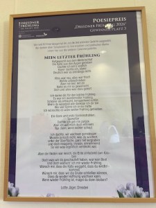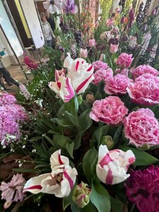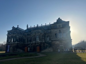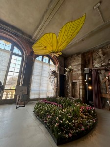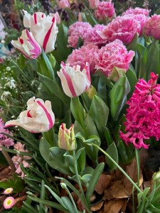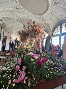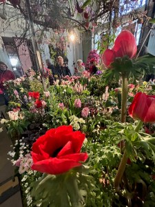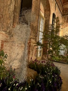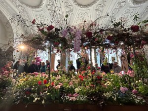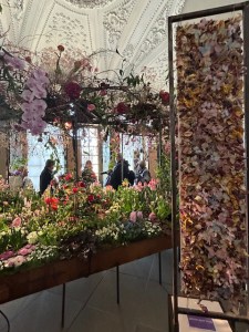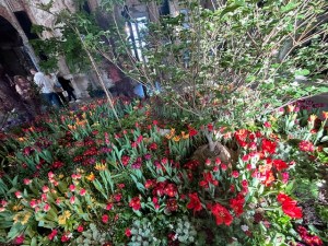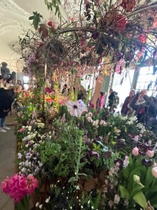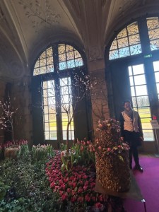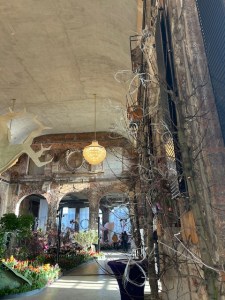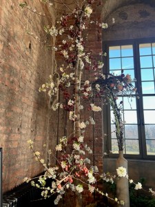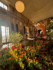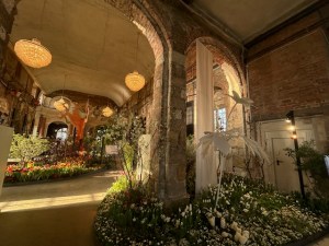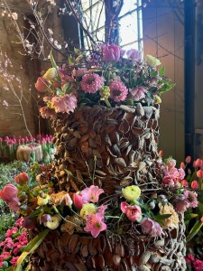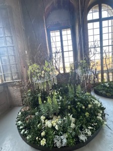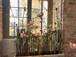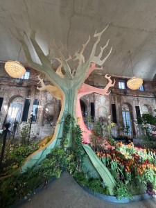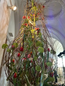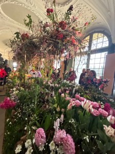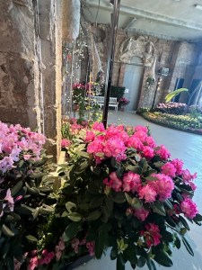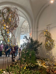 Bezaubernd gleich im ersten Raum ein großes Blumenbeet, um das herum man wandeln und all die Blumenschönheiten, vom kleinen Schneeglöckchen, Anemonen, Tulpen, Hyazinthen und viele mehr, die das Herz um diese Jahr erfreuen, betrachten kann. Unter der weißen, schon restaurierten, prachtvollen Raumdecke hängen mit Zweigen geflochtene Blumenkränze. An einer Holzwand tummeln sich Schmetterlinge aus Seide vor Blütenblättern. Schönheit und Vergänglichkeit liegen nah beieinander. Glanz, kunstvolle sandsteinerne Skulpturen und rohe Ziegelwände. „Der August der Starke wusste schon was schön ist, dem wir die Kunstschätze in Dresden zu verdanken haben“, sagt eine Mitarbeiterin der Blumenschau mit Blick auf die wunderschönen Räume. Sie steht in einem Raum mit zart rosa blühenden Mandelbäumchen und Torten, geformt aus Mandelblättern und verziert mit leuchtend farbigen Frühlingsblüten. Ein Augenschmaus!