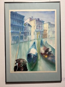 In witzigen Collagen treten „Mantel- und Hosenfische“ gegeneinander an, die formspielerisch Schals mit Fransen als Kiemen tragen. „Die Grossen fressen immer die Kleinen“, steht darunter. Im Frühjahr will er wieder rausgehen und zeichnen.Werner Pinkert schaut mit Offenheit und Neugier in die Welt, besitzt ganz offensichtlich immer noch Heiterkeit und Freude an den kleinen Dingen. Und er hat eine innige Beziehung mit seiner Frau und der Familie. Sie gehen spazieren, reden und lachen viel zusammen, sagt seine Tochter, die die Ausstellung kuratiert hat. Jeder Moment sei ein Geschenk. Das Venedig-Bild sieht sie auch als ein Sehnsuchtsbild, das daran erinnert, in einer schnelllebigen Zeit seine Träume nicht zu vergessen und immer wieder den Aufbruch zu wagen.