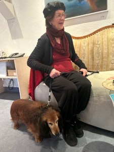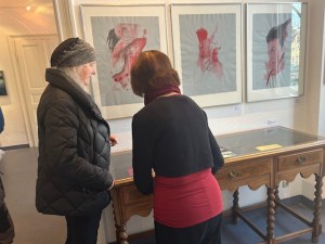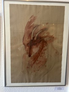 Immer wieder tauchen Paare und Frauen mit Tieren auf, die an Naturgöttinnen erinnern, wundersam, erhaben und selbstbewusst, begleitet von vielerlei Getier wie Raben, Mäuse, Ratten, Schlangen, Fische, Geparden und Katzen. Auch der Kasper ist „als Spiegelbild der Gesellschaft“ in einem Bild zu sehen, mit herabhängender roter Mütze, der auch immer etwas Trauriges hat, und sich selbst umarmt oder auf die Schulter klopft selbstverliebt. „Wenn sich der Kasper liebt…“, heißt der vieldeutige Titel. Das Gesicht ist nachdenklich, versunken, weiblich. Es könnte auch ein Selbstbildnis der Malerin sein. „Die eigenen Wertvorstellungen behalten, hochhalten“, ist ihr wichtig. Der Titel „handsam“ bezieht sich darauf, dass es Handzeichnungen sind. „Ich kann das machen, was mir nahe ist. Die Quintessenz ist das freundliche, zärtliche Miteinander zwischen allen Lebewesen, die Anteilnahme, das Akzeptieren des Anderen. Das Sosein. Dazu ist man kaum noch in der Lage“, sagt Angela Hampel zu ihren Bildern. „Ich gehöre ja zu einer Generation von Menschen aus dem Osten, deren Werte am Verschwinden sind. Die Kunst auch mit einer gewissen Haltung machen und die Dinge auch anders sehen.“ Es gebe auch so etwas wie Herzanstand. Berühren hat mit anfassen, die Hand geben zu tun.