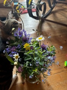 Selbst das Schreiben, das sie so sehr liebt, fällt ihr zurzeit schwer. Oft fließen Tränen, wenn sie an ihre beiden Katzen denkt. Bilder von ihnen sieht, ganz frühe, als sie noch klein waren und spätere, die ihre prächtige Entwicklung zeigen. „Mir verschlägt es auch fast die Sprache, ähm den Schnabel. Von Fliegen ganz zu schweigen“, sagt Firlefanz zu der Frau. Doch beim Schreiben kann man sich auch erinnern, Schönes und Liebgewonnenes festhalten und bewahren für sich selbst und andere, sagt die Frau liebevoll zu ihm. Sie ruft weiter ihre Namen Jade und Lina und manchmal auch Lola und redet mit ihnen, wenn sie die Wohnung verlässt und wiederkommt. Sie begrüßt sie und erzählt ihnen, was sie gerade isst und tut. Im Blumenkasten im Wintergarten steht ein Bild von ihnen, ein kleines Zepter mit Knospen und ein Kerzenglas, davor und auf Jades offenem Karton, wo sie oft saß, immer ein frischer Wildblumenstrauß. Ihr Bild, ihr weißes Fell leuchtet auch im Dunkeln. Und sie sehen sie weiter mit ihrem aufmerksamen, sanften, tiefen, innigen, manchmal traurigen Gesichtsausdruck an.