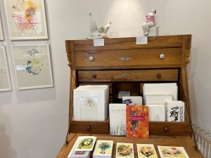 Eine lebensgroße Holzskulptur, aus deren Mitte ein Baum hervor wächst, der sie zusammenhält, steht im Schaufenster mit Blick auf den Marktplatz. Neben ihr steht eine Tänzerin in rotem Rock und schwarzem Pullover und nähert sich langsam der Skulptur. Diese und die Malerei im Musikladen in der Kirchgasse 2 in Bärenstein stammen von Mario Nitschke. Landschaften, Orte und Figürliches, von konkret, kubistisch bis surreal, in leuchtenden, erdigen und meerblauen Farbtönen, die angeregt sind von Lionel Feininger und Salvatore Dalí, zeigt er in dem neuen Veranstaltungsraum. „Es ist eine Reise in Bildern von Bärenstein bis an die Küste und nach Forst in der Lausitz“, sagt Mario Nitschke, der dort aufwuchs, seit 1999 freiberuflich als Maler und Bildhauer in Bärenstein lebt und seit einer Weile als Praxisberater in der Oberschule Geising tätig ist, u.a. den Marktbrunnen in Bärenstein gestaltete.