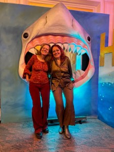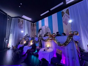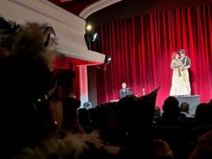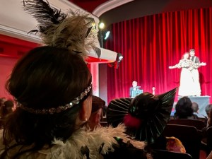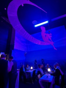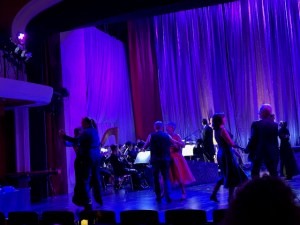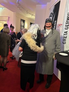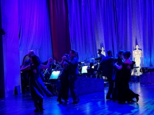 Musik & Kunst in Bewegung: Bei der Ausstellungseröffnung im Musikladen mit den Musikern Hartmut Dorschner, Saxofon und Agnes Ponizil, Klavier und der Tämzerin Valentina Cabro, die mit den Kunstwerken und Besuchern interagierte. Hier sind eine Holzskulptur und Malerei von Mario Nitschke zu sehen.