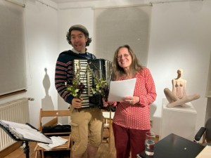 Diesmal drehte sich alles um Rhythmus in dem einwöchigen Musik-Workshop mit dem Dozenten und Schlagzeuger Matthias Macht und dem Jazzmusiker und Leiter des Musiksommer Bärenstein Hartmut Dorschner. Vor dem Mikro stehen nacheinander die Teilnehmer. Junge und etwas ältere, schon erfahrene Musiker, reihum. Sie heben bemalte und beschriftete Karten mit Symbolen und Titeln der selbst erdachten Musikstücke und Songs hoch und die anderen spielen und improvisieren diese mit viel Spaß und Einfällen zusammen im Orchester. Zehn Musikanten haben sich dazu versammelt im Veranstaltungsraum im Obergeschoß vom Kunsthaus Bärenstein, zugleich Wohn- und Schaffensort von Hartmut Dorschner. Die Töne hüpften, sprangen, schwebten umher. Mal klang es wie ein Frosch, der lustig im Teich quakte, mal nach Jazz, Swing und Reggae, mal urwüchsig erdig und geheimnisvoll mit der erzählten Mär von einem Waldweiblein aus dem Erzgebirge. Frei aus dem Bauch und fabulierfreudig tönte und erzählte der Geschichtenerzähler Michael Cech aus Dresden solo und zusammen mit dem BärensteinOrchester. Die Musiker bewegten sich auch samt Instrumenten durch den Raum, als ob sie ihre Töne wieder einfangen wollten. Schön zu erleben das Zusammenspiel und die Klangvielfalt von Trompete, Saxofon, Akkordeon, E-Piano, Schlagzeug, kleinen Trommeln bis zu E-Gitarren. Die jüngste Zuhörerin saß mit Kopfhörern auf dem Schoß von Papa und Mama abwechselnd, vergnügt lauschend und hin und wieder jauchzend einstimmend in das Konzert. Abschließend war auch ein Lied, „Skandal im Bielatal“ gegen die geplante Ansiedlung einer Lithium-Fabrik und damit einhergehender Naturzerstörung in der Umgebung von Bärenstein zu hören. Viel Beifall gab es von den begeisterten Zuhörern nach einer Stunde für dieses bunt gefächerte, klangfreudige Konzert mit dem BärensteinOrchester, dem man weiteren Zulauf und Auftrittsorte wünscht.