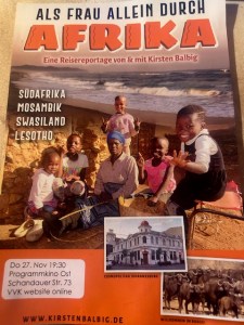 Heute am 27. November, um 19.30 Uhr könnt Ihr im Programmkino Ost, Schandauer Str. 73, in Dresden eine Live Reisereportage in Bildern und Erzählung mit Kirsten Balbig „Als Frau allein durch Afrika“ von und mit Kirsten Balbig von ihren jüngsten Reisen nach Südafrika, Mosambik, Swasiland und Lesotho erleben.